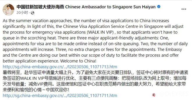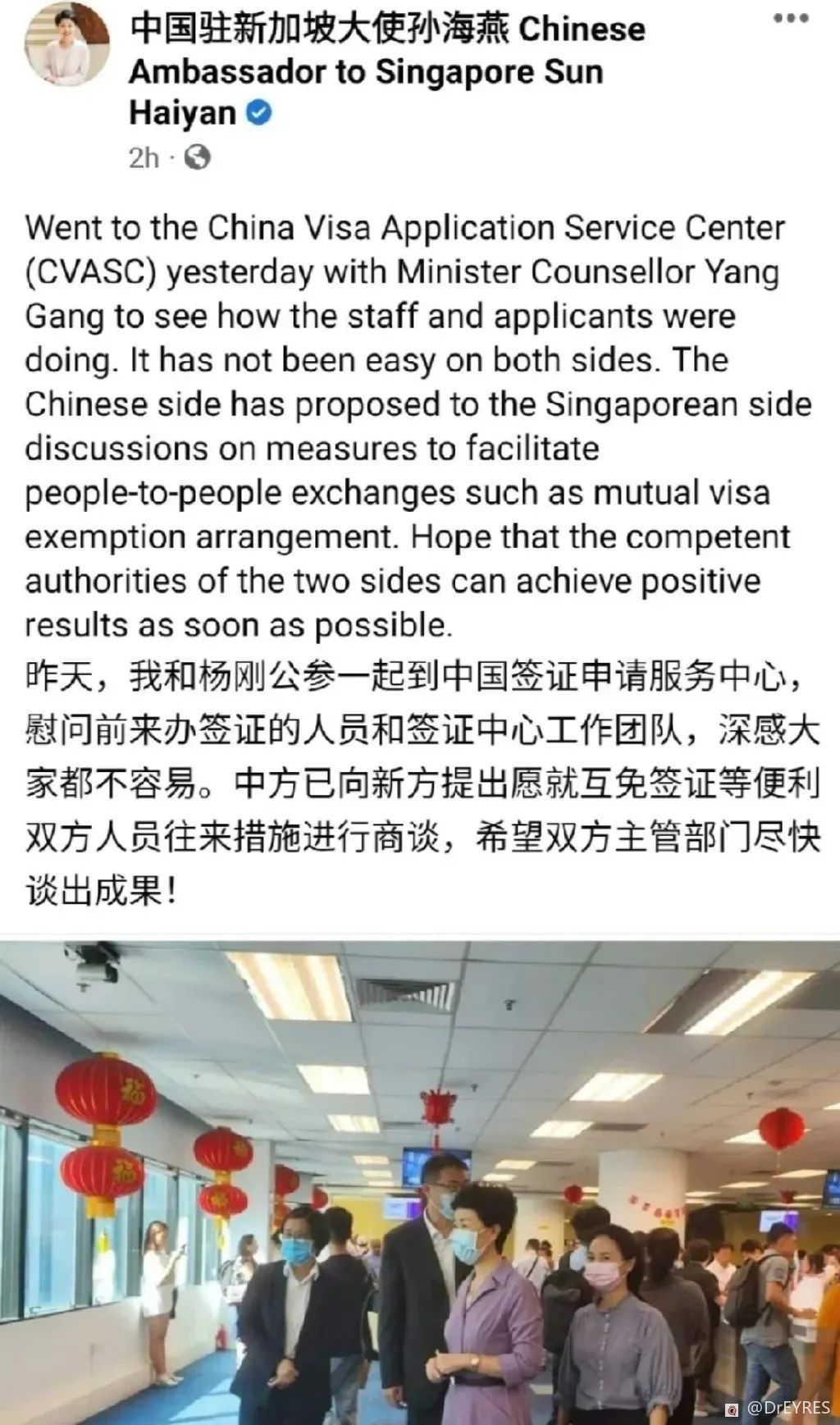 就在上个月,孙海燕大使曾发文表示,中方已向新方提出愿就互免签证等便利双方人员往来措施进行商谈,希望双方主管部门尽快谈出成果。