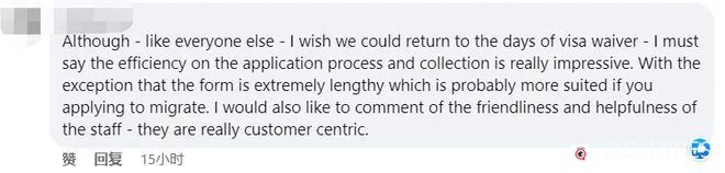 “虽然和其他人一样,我希望我们能新加坡能够免签如今中国,但我仍必须说签证申请服务中心的申请流程和资料收集的效率确实令人印象深刻。当然,需要填写表格似乎有些冗长......另外我还想赞扬那里工作人员的友好和乐于助人的态度,他们真的以服务他人为中心的”