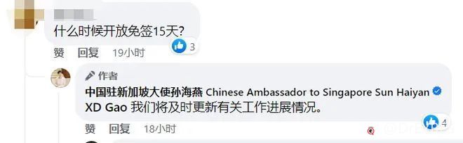 当然,很多人最关心的问题还是中新免签何时恢复问题,不少网友在孙海燕大使脸书贴文下留言,希望恢复新加坡护照对华免签15天的待遇。